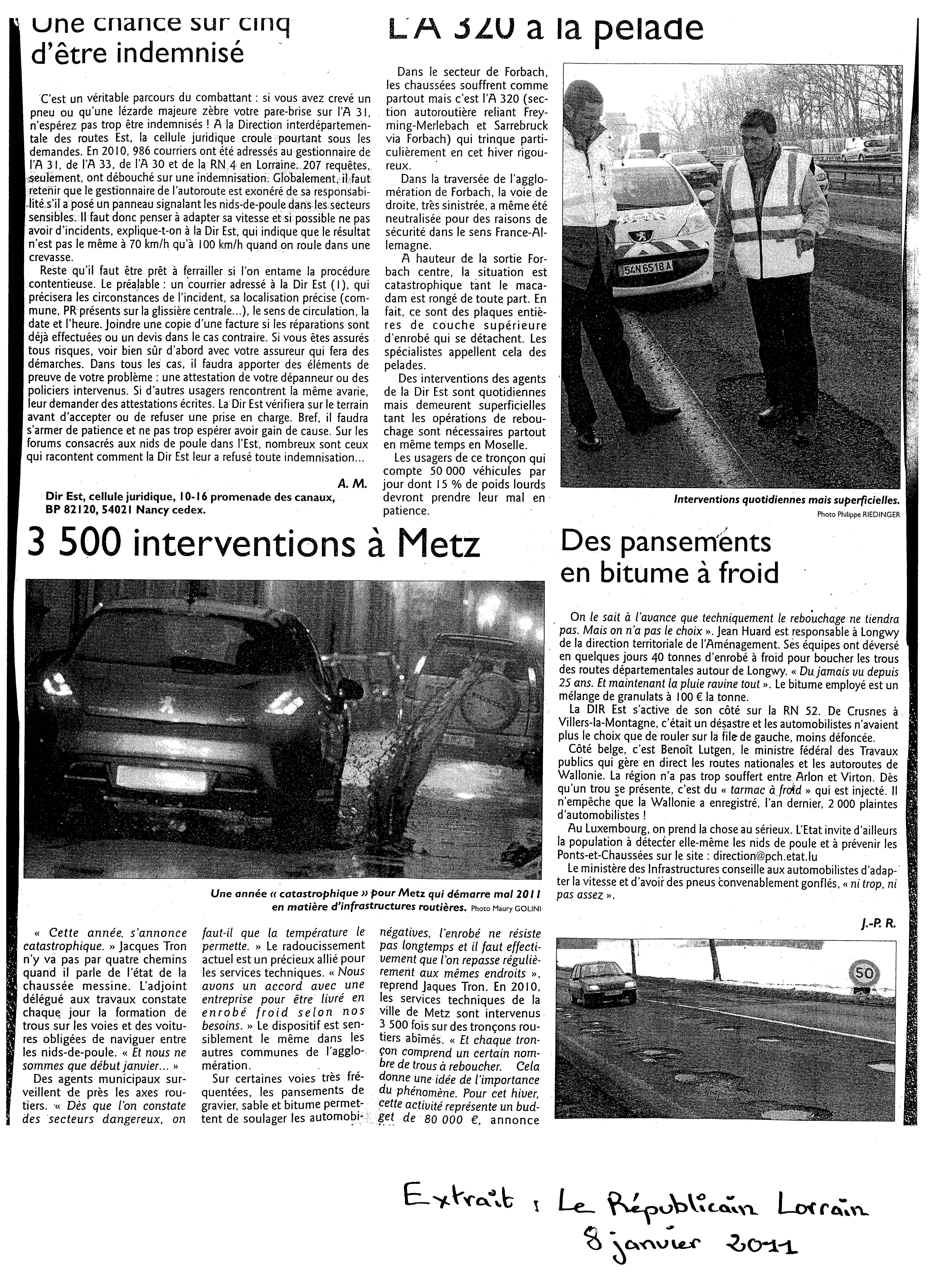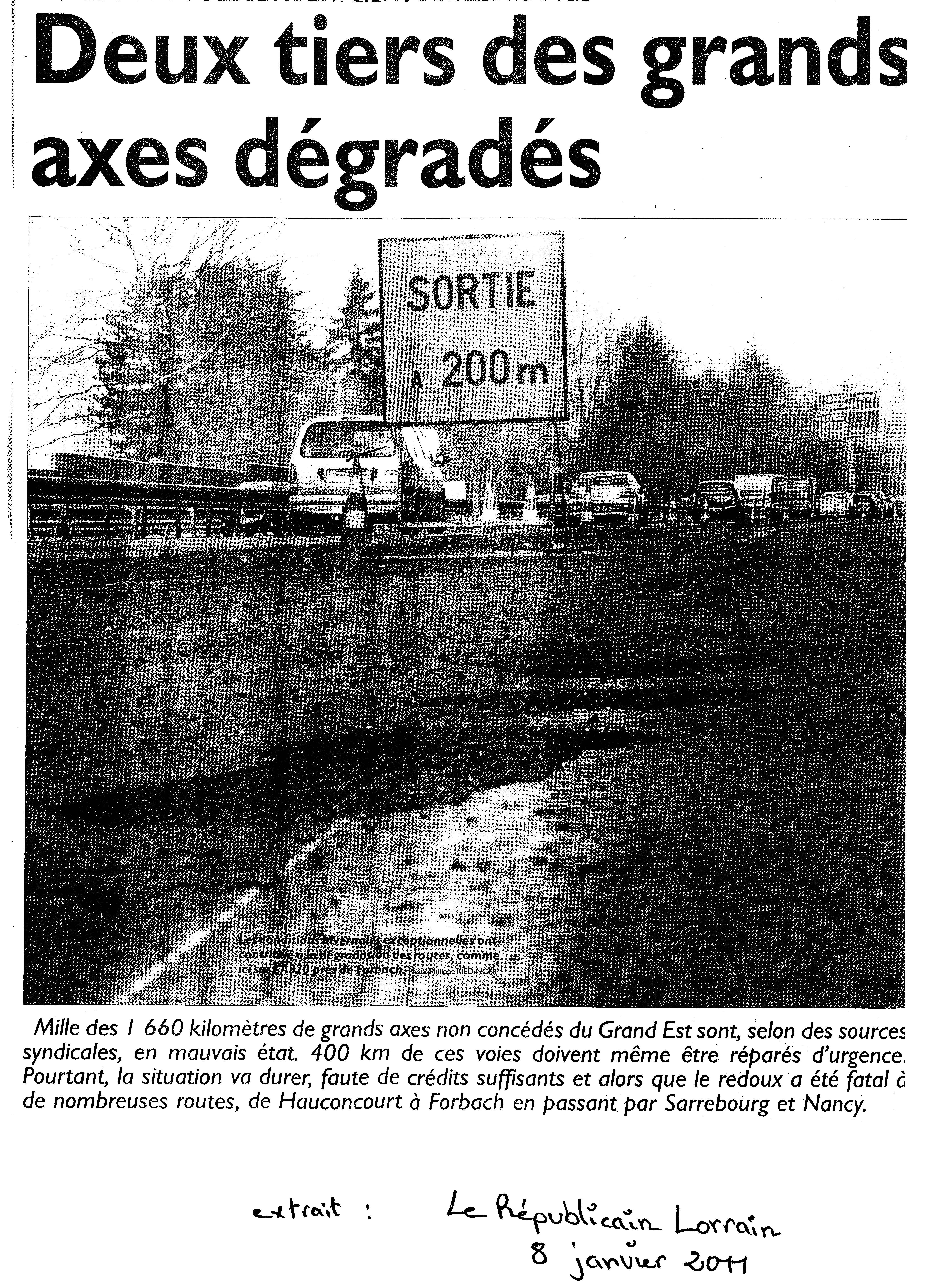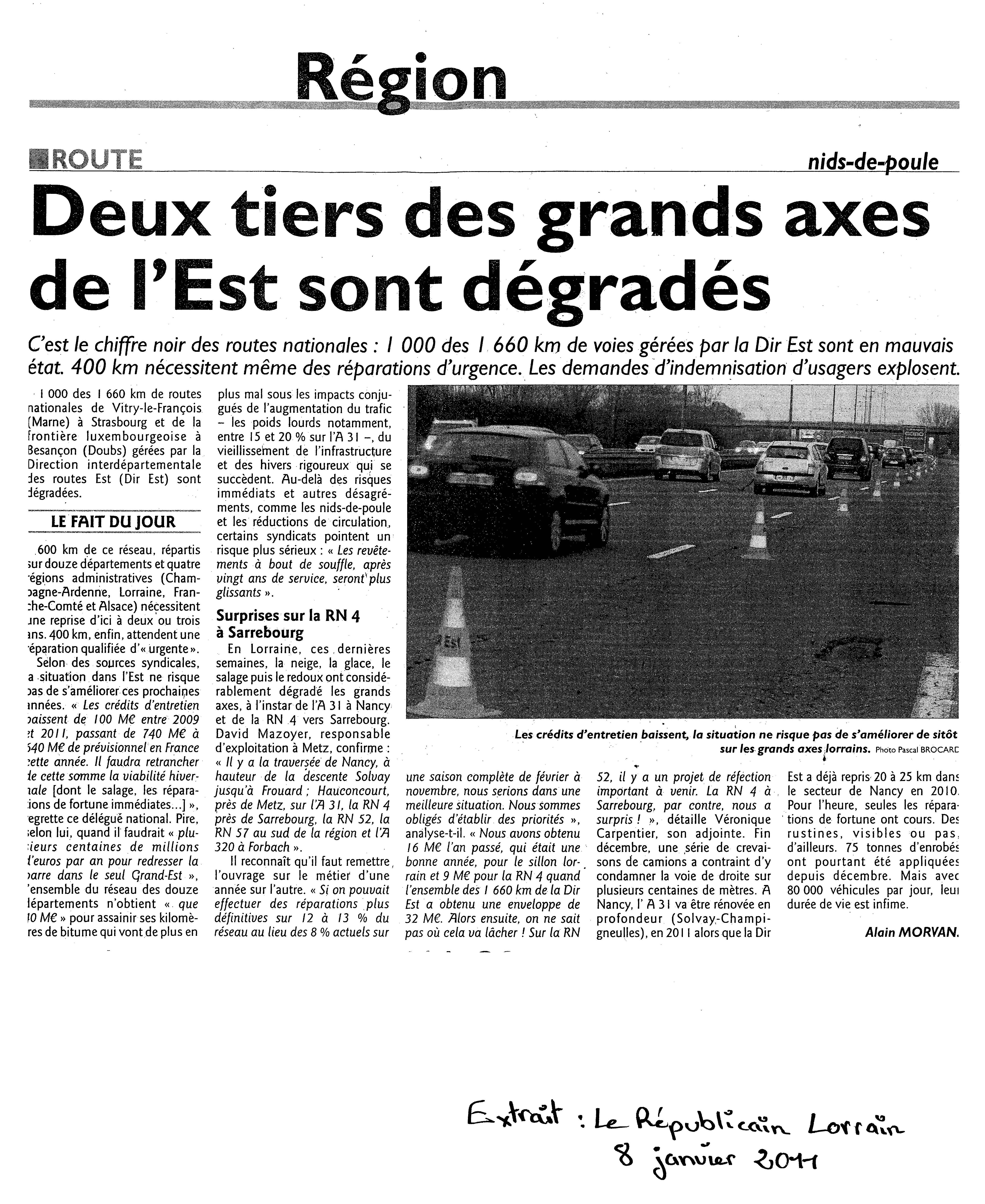 Baisse des crédits routiers 17/01/2011 Le Républicain Lorrain se fait l’échos des conséquences concrètes pour les usagers de la routes. Laisser un commentaire Annuler la réponse Vous devez vous connecter pour publier un commentaire.